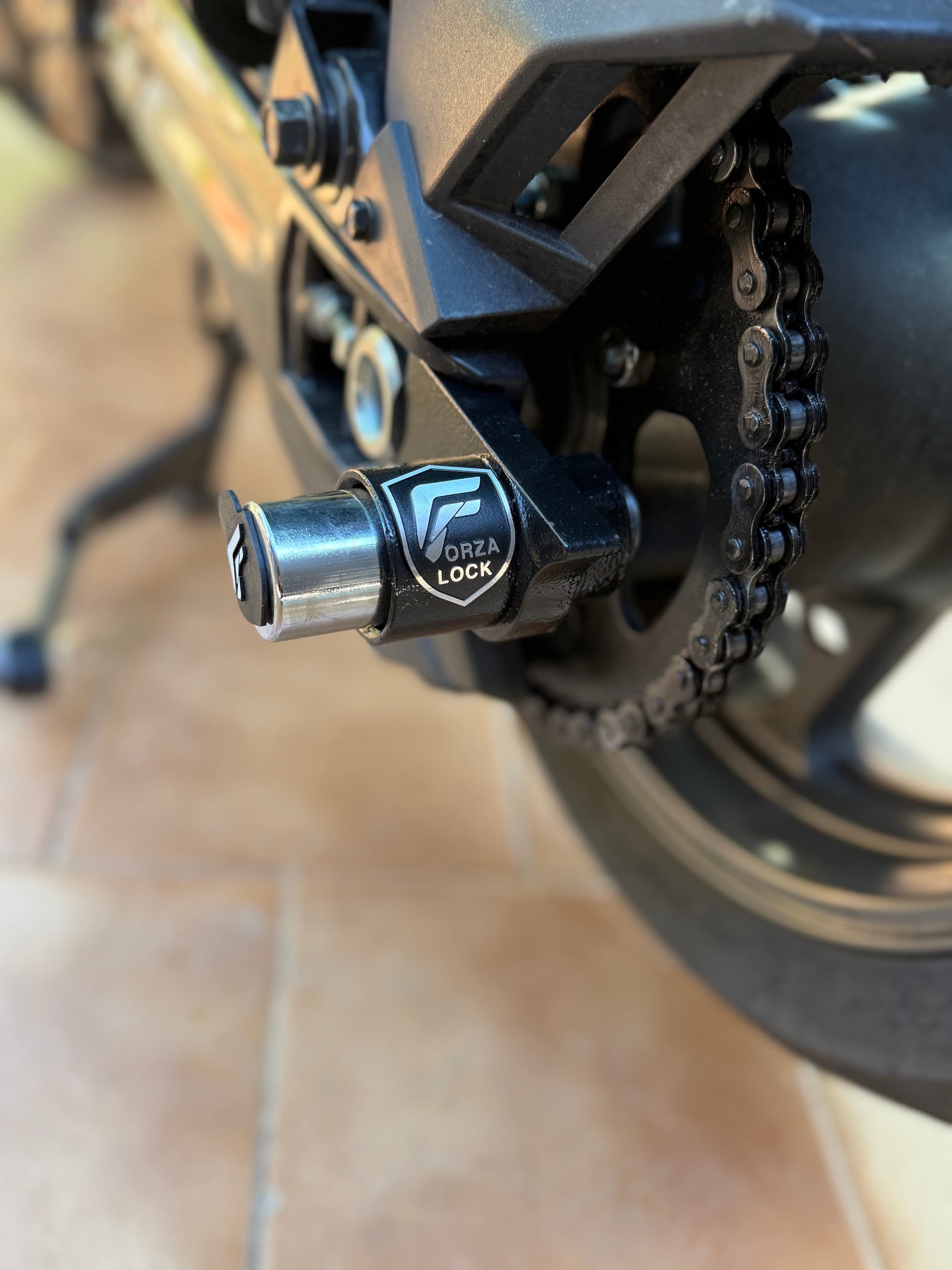 Un pistone di diametro 25 mm, che si inserisce perfettamente nel disco, nella corona o nel cerchio, a seconda del modello di moto, assicurando una protezione solida contro i tentativi di furto.
